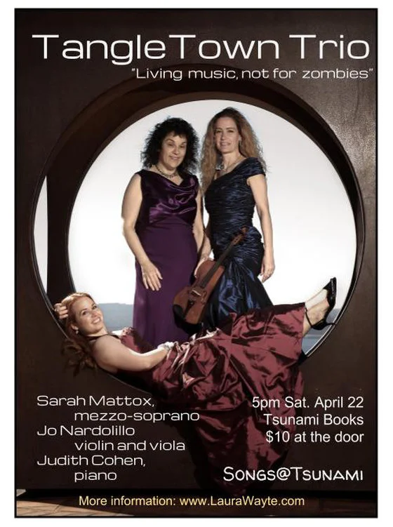 Saturday, April 22, 5-7 PM: The Songs at Tsunami Chamber Concert Series, hosted by Laura Wayte. This month’s feature is The Tangle Town Trio (“Living Music, not for Zombies”). The trio includes Sarah Mattox, mezzo soprano, Jo Nardolillo, violin and viola, and Judith Cohen, piano. More info at http://www.laurawayte.com/ (suggested donation $10 at the door)
