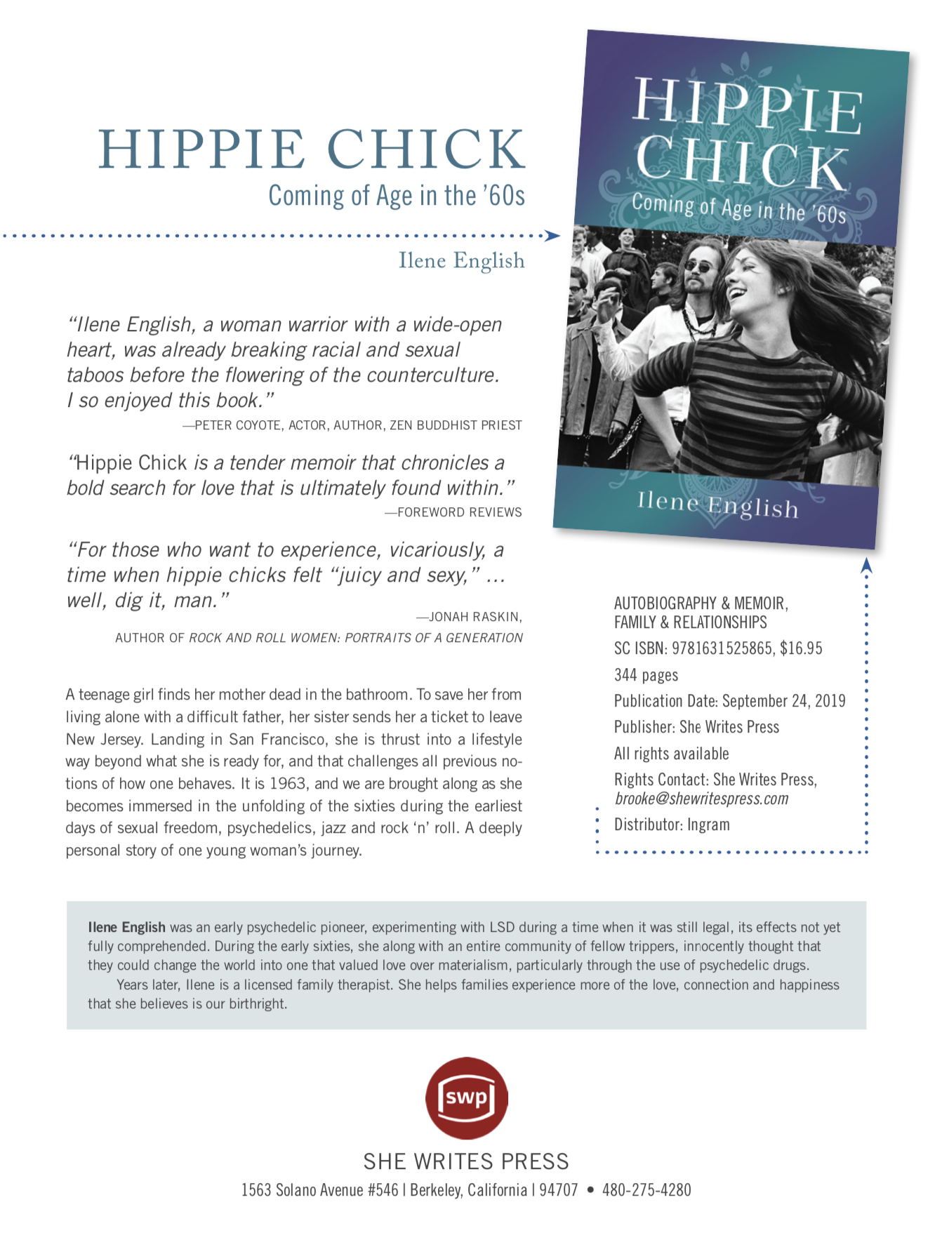 Sunday, October 13, 2 PM: Reading and Booksigning by Ilene English (formerly of Eugene), author of “Hippie Chick: Coming of Age in the Sixties.” In this memoir, a rebellious teenager finds her mother dead in the bathroom. To save her from living alone with a difficult father, her older sister sends her a one-way ttcket to San Francisco. It is 1963, and we are brought along as Ilene becomes immersed in the sixties during the earliest days of sexual freedom, psychedelic drugs, the jazz scene and rock and roll… Of particular interest to Eugenians, for many years Ilene was involved with the Eugene Saturday Market, including as Manager. Today, English is a licensed psychotherapist